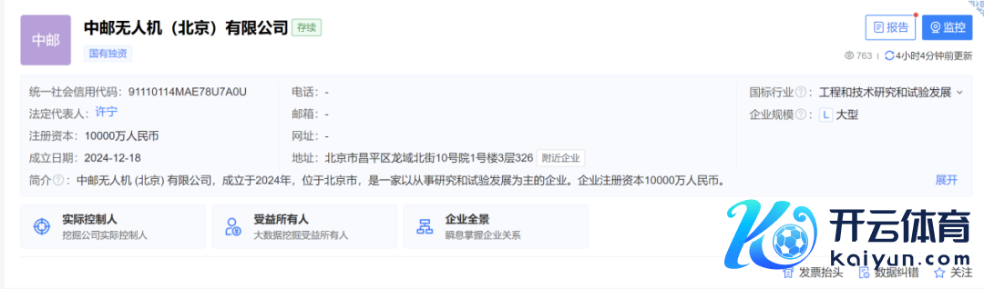 据了解,中邮无东谈主机(北京)有限公王法定代表东谈主为许宁,由中国邮政集团有限公司旗下中国邮政速递物流股份有限公司全资捏股,注册老本达 1 亿元东谈主民币。计较范围含智能无东谈主飞翔器制造、智能机器东谈主的研发、智能机器东谈主销售、东谈主工智能硬件销售、东谈主工智能通用期骗系统、东谈主工智能行业期骗系统集成行状等。