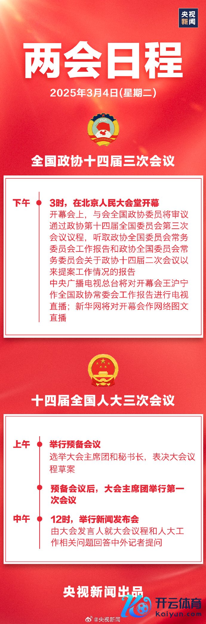 据东谈主大会议新闻中心官微音尘,2025年3月5日(星期三)上昼9时,十四届宇宙东谈主大三次会议将在东谈主民大礼堂举行开幕会。